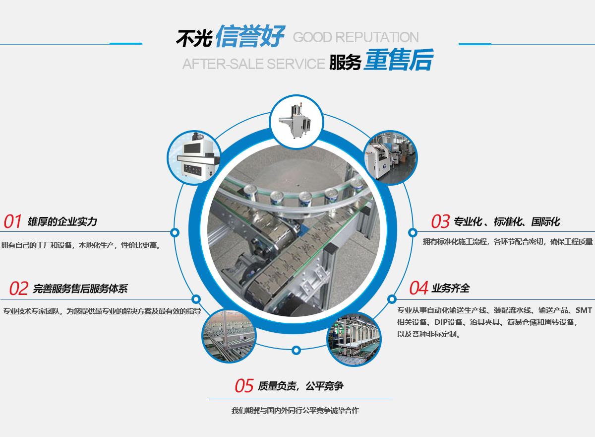 我公司致力于電子、工業(yè)新技術推動的新產品工藝的設備配套,專業(yè)從事自動化輸送生產線、裝配流水線、輸送產品、SMT相關設備、DIP設備、治具夾具、簡易倉儲和周轉設備,以及各種非標定制.....